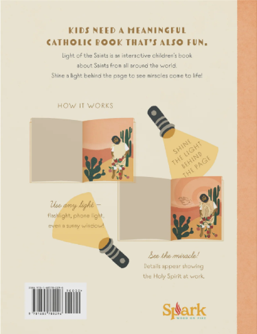 An interactive, light-based book of Catholic saints from around the globe, created to inspire your kiddos with stories of how God's light shone in their lives. Shining a light behind the page reveals the Holy Spirit at work. This fun, interactive book is an answered prayer for parents and grandparents seeking to teach their kids and grandkids about the saints.