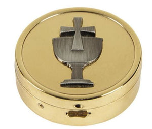Carry the consecrated hosts in this beautiful Chalice & Cross Pyx on your visitation to the sick or homebound. This vessel holds up to ten hosts and bears the Chalice & Cross on an embossed metal design. The solid brass with a high polished finish inside and out make this pyx a wonderful value and a secure latch closure provides a barrier to dirt and moisture.