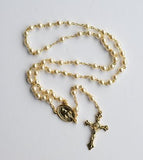 ROSARY FEATURING PEARL AND GOLD-TONED CENTERPIECE AND CRUCIFIX. CENTERPIECE IS MIRACULOUS MEDAL.