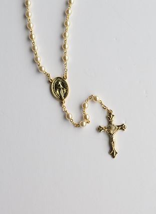 ROSARY FEATURING PEARL & GOLD-TONED CENTERPIECE AND CRUCIFIX